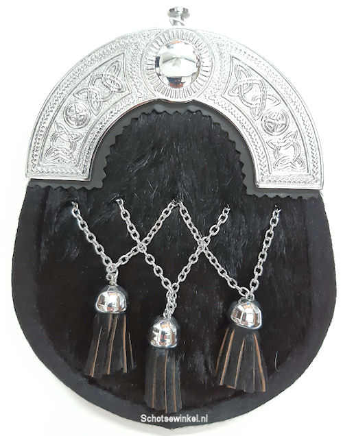 Sporran, Zwart, leer, celtic, pin, 3 tassels